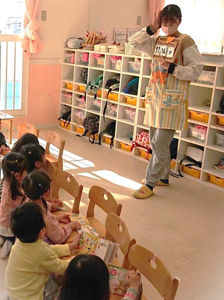 大宮たんぽぽ保育園 先生がカレンダーで今日は何日とつたえています。