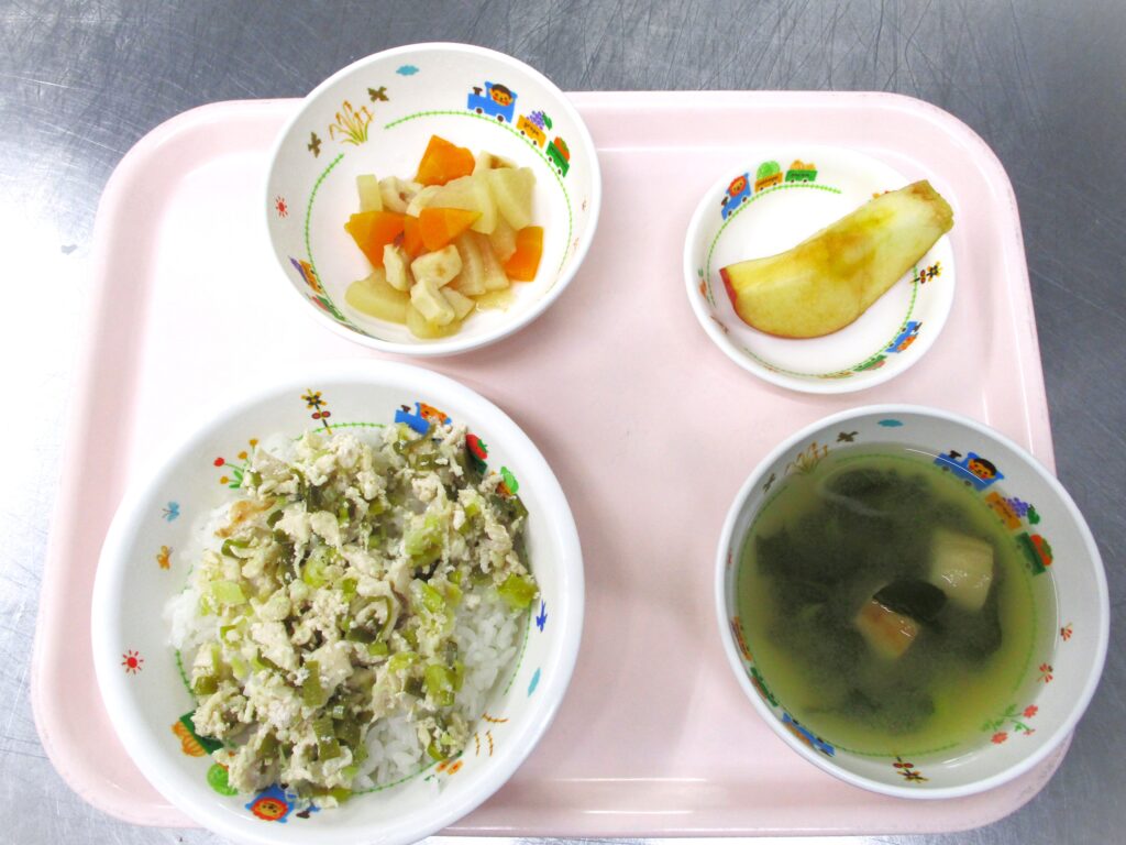 🍗鶏肉のねぎ塩丼 🥬小松菜のみそ汁 🍢おでん風煮 🍎りんご