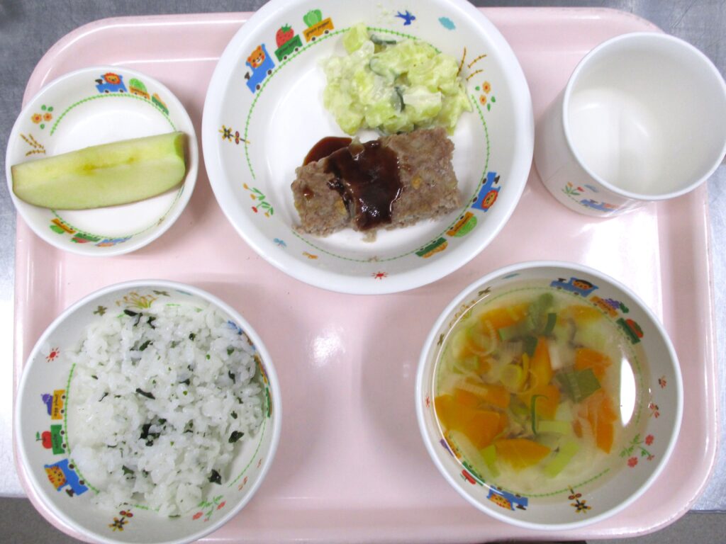わかめごはん🍚スープ🍲ハンバーグ🧑🍳さつまいもサラダ🥗りんご🍎