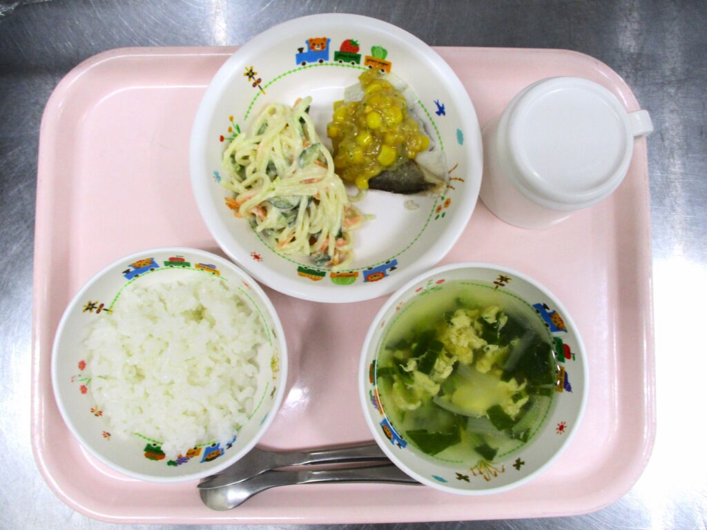 🍚ごはん🥚たまごと青菜のスープ🐟白身魚の🌽コーン焼き🥗スパゲティサラダ