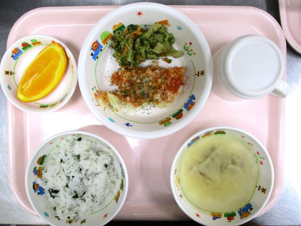 わかめごはん🍚 スープ🍲 ジャガイモのミートソース焼き🍽️ ブロッコリーのごま和え オレンジ
