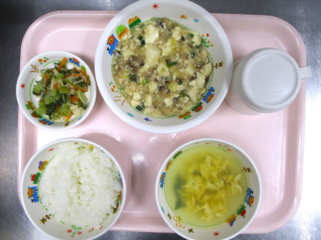 🍚ごはん🍽️たまごスープ🍛マーボー豆腐🥬チンゲン菜の中華風サラダ🥗