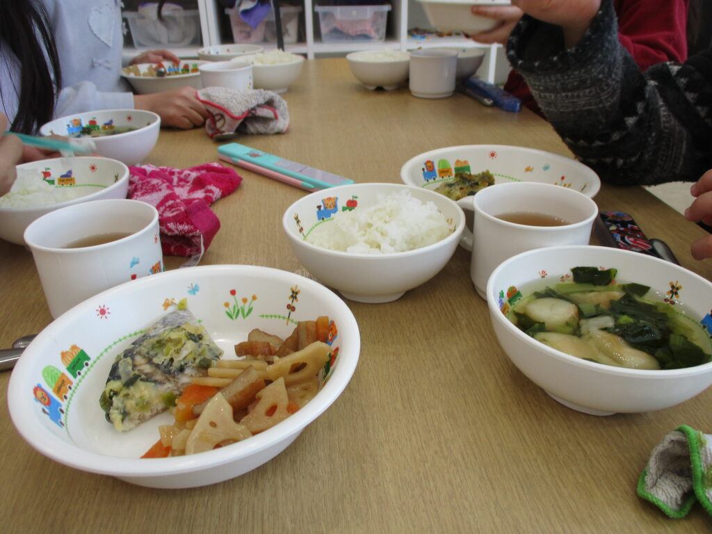 園庭でたくさん遊んで、お腹ペコペコになった子どもたちはあっという間に給食を食べられました。