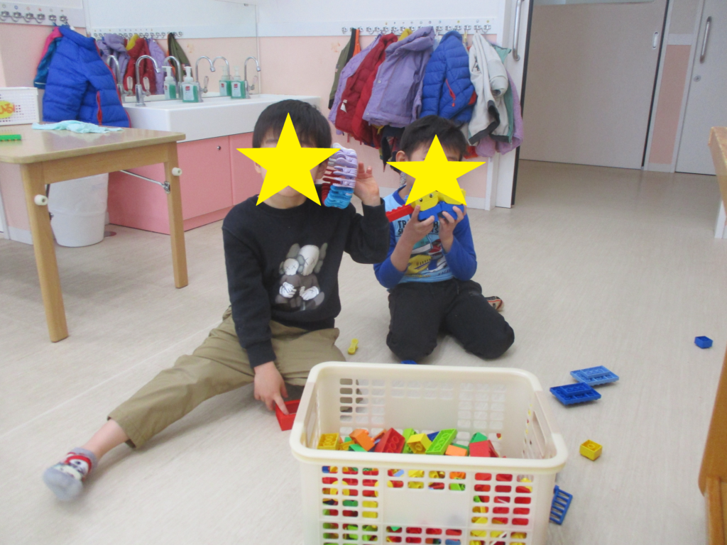 部屋で過ごしました。男の子はブロックで銃や剣を作って忍者ごっこや戦隊ヒーローになりきって遊んでいます。女の子たちは、ぬいぐるみを赤ちゃん代わりにしてお世話をしてママになりきって遊んでいました。