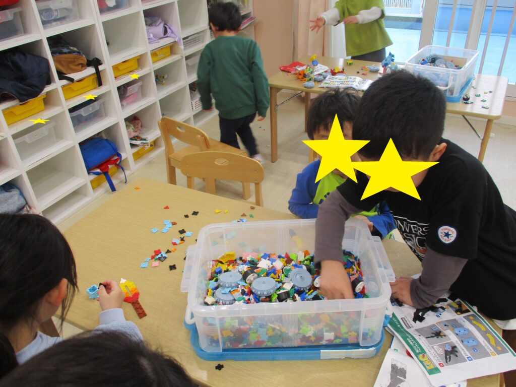 かりん組さんはLaQの玩具が好きで、説明書を見ながら集中してあそんでいました🧩