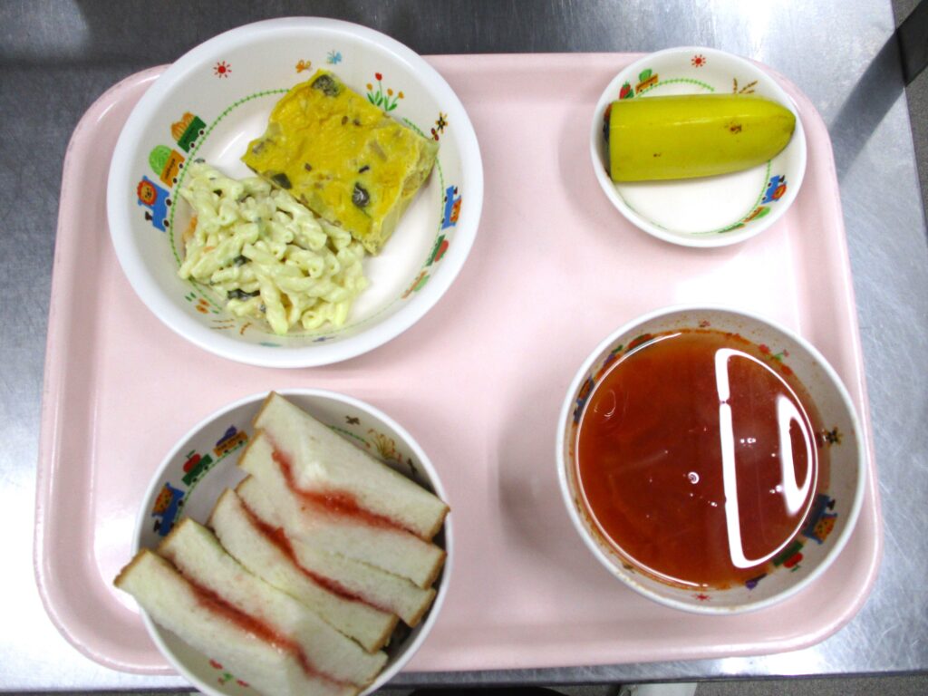 🍞パン🍓ジャム🍅ミネストローネ🥚スパニッシュオムレツ🥗マカロニサラダ🍌バナナ