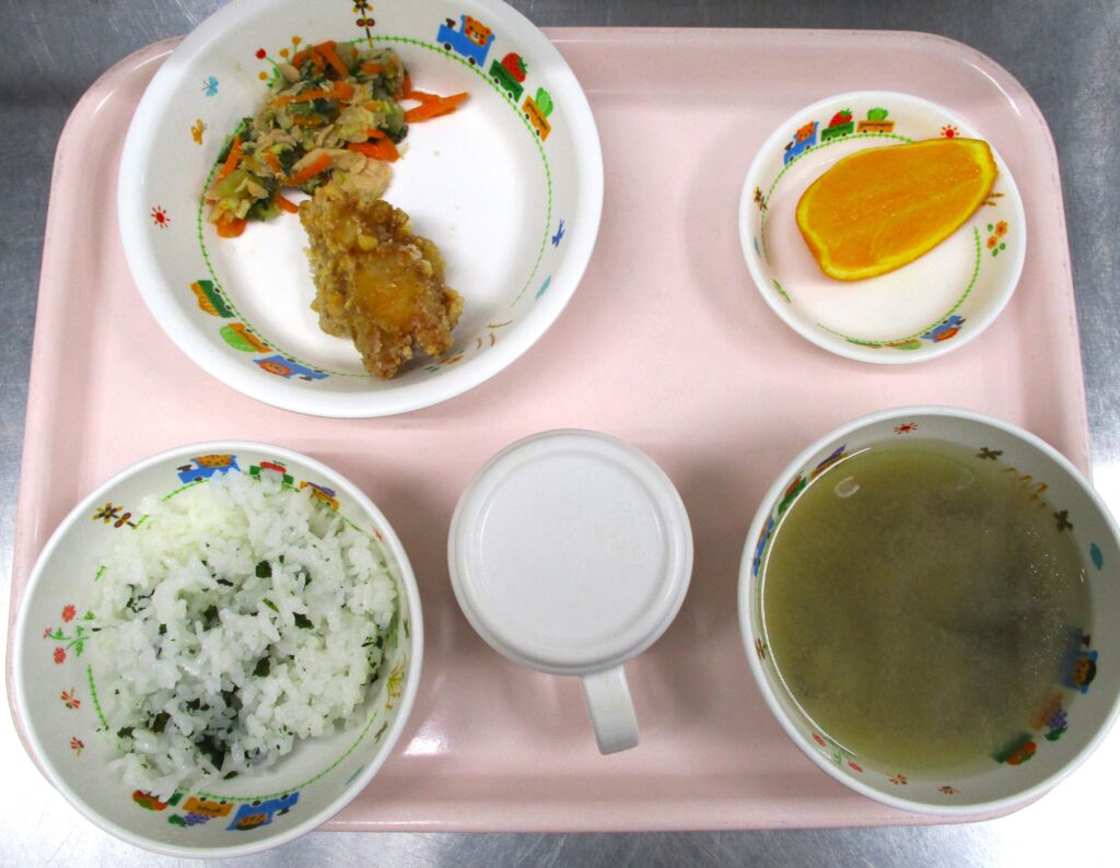 大宮たんぽぽ保育園🌈 鶏肉のから揚げ 2024.04.15 46view さいたま市北区 大宮たんぽぽ保育園🌈 今日の給食🍽️ わかめごはん🍚ナスのみそ汁🍜鶏肉のから揚げ🍗白菜とツナのサラダ🥗オレンジ🍊 いただきます。 ◀ 前へ | たんぽぽ保育園のブログ 一覧 | 次へ ▶ 関連記事 2026.04.242歳児 こいのぼり製作🎏 2026.04.24豆腐ハンバーグ🍽️ 2026.04.231歳児 お散歩 2026.04.22🐟ぶりの照り焼き🍽️ たんぽぽ保育園のブログ