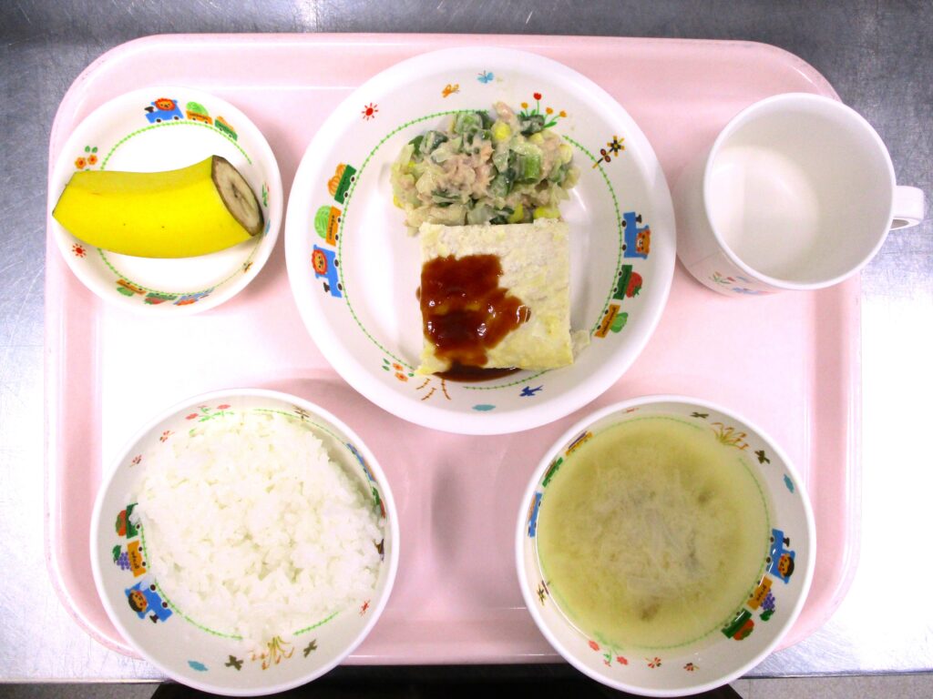大宮たんぽぽ保育園🌈 2024.04.26 62view さいたま市北区 大宮たんぽぽ保育園🌈 今日の給食🍽️ 🍚ごはん🍲みそ汁🍽️豆腐ハンバーグ🥬インゲンのツナ和え🍌バナナ いただきます。 ◀ 前へ | たんぽぽ保育園のブログ 一覧 | 次へ ▶ 関連記事 2026.04.242歳児 こいのぼり製作🎏 2026.04.24豆腐ハンバーグ🍽️ 2026.04.231歳児 お散歩 2026.04.22🐟ぶりの照り焼き🍽️ たんぽぽ保育園のブログ