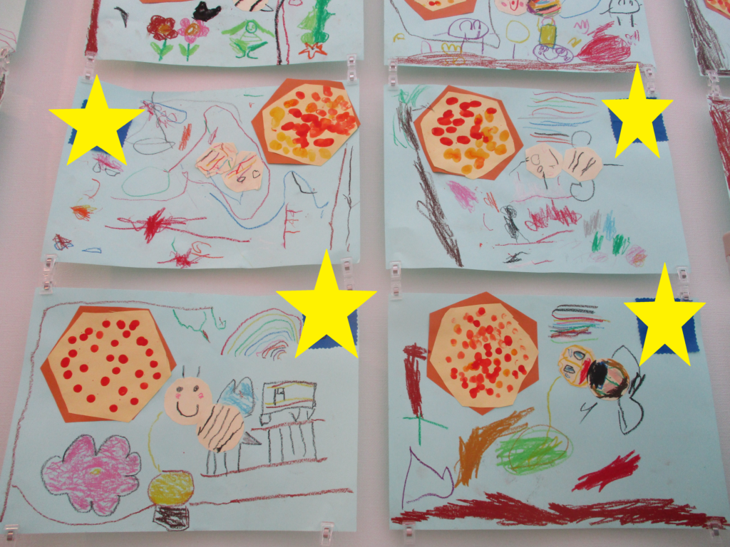 指スタンプで黄色とオレンジの絵の具を使って蜂の巣を作り可愛い作品が出来上がりましたよ😊