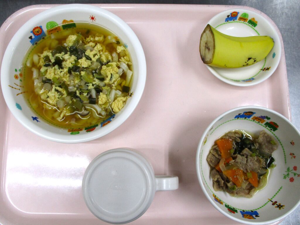 かき玉うどん🍜豚肉の香り炒め🍗バナナ🍌