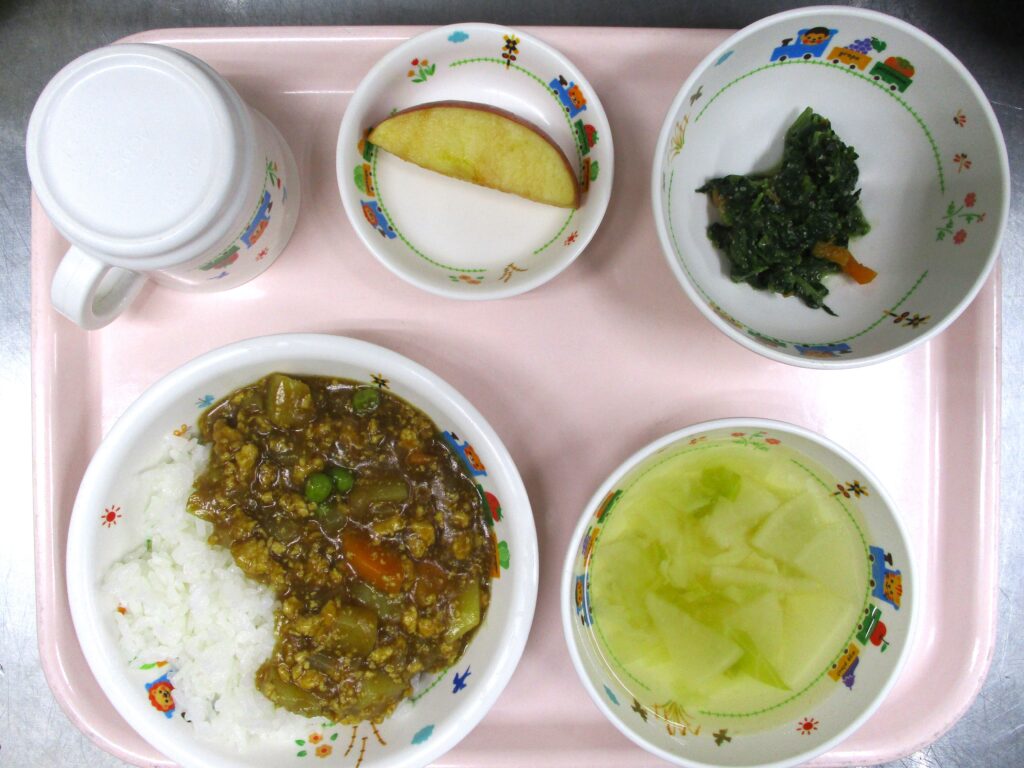 キーマカレー🍛キャベツのスープ🍽️ほうれん草のゴマ和え🥬りんご🍎