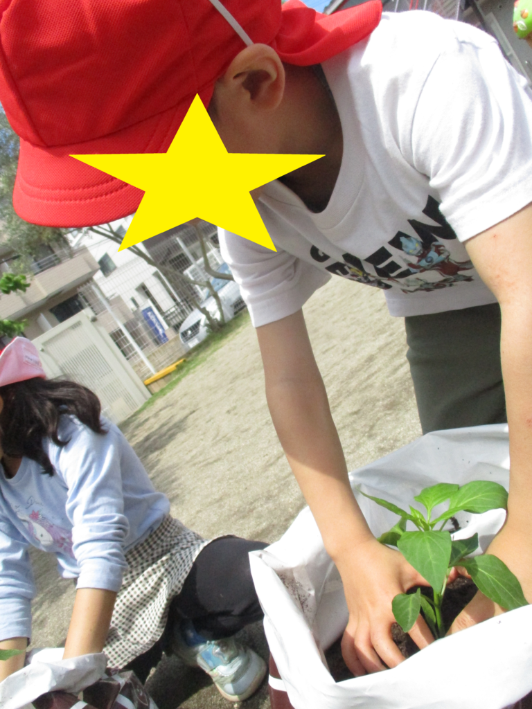 今日は5歳児クラスがプチピーマンの苗植えを行いました!