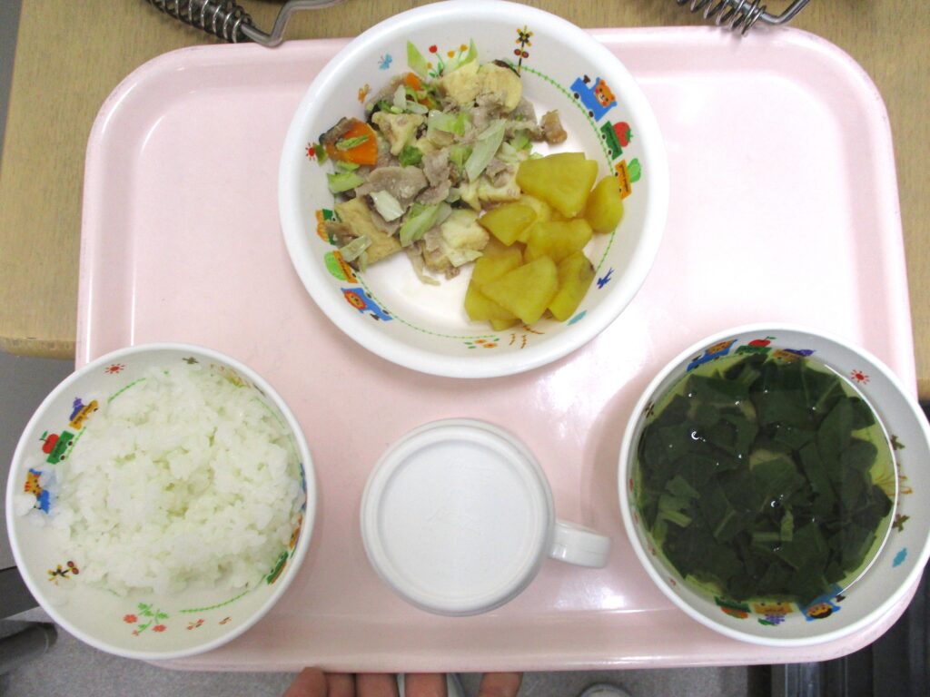 🍚ごはん🥬ほうれん草のすまし汁🥩豚肉と生揚げの炒め物🍠さつまいもの甘煮