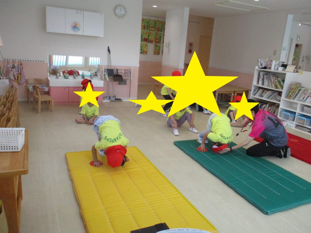 また、5歳児クラスは前転も行ないました。先生のお話を聞いて一生懸命取り組み、回り終わると両手