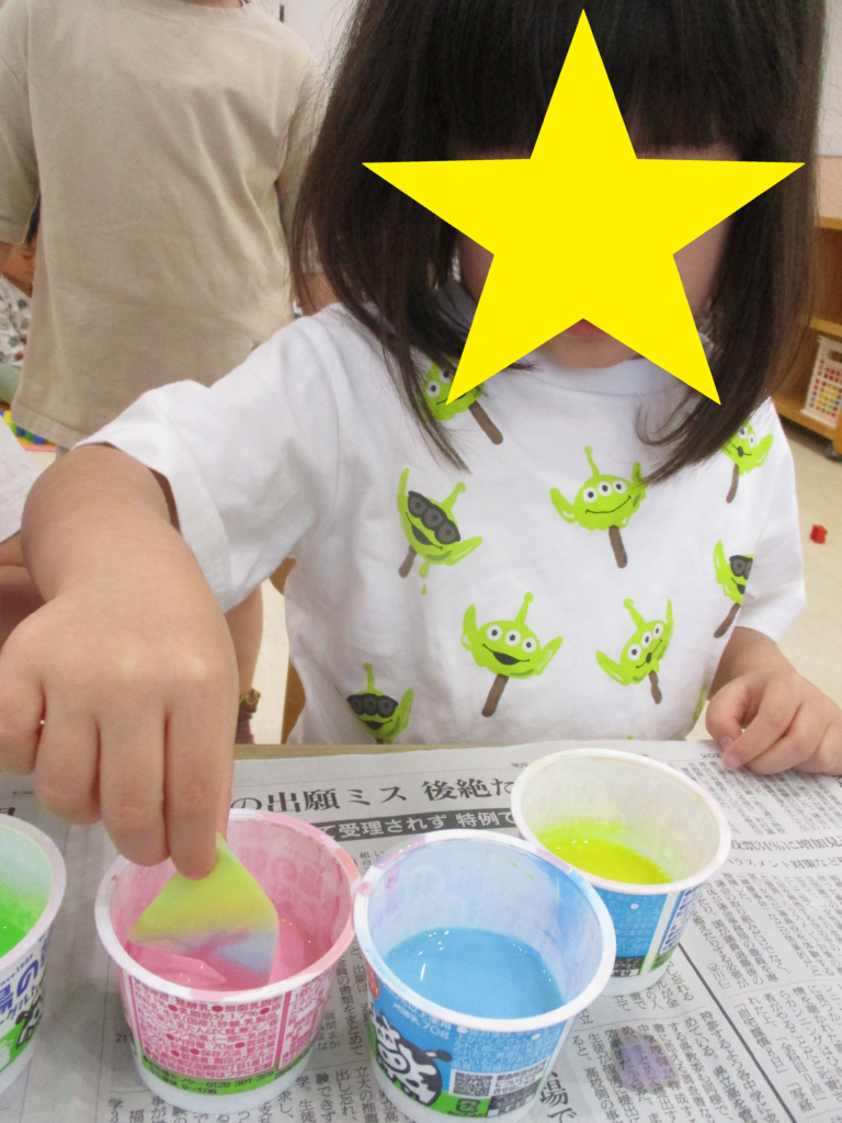 子どもたちは一生懸命「ちょこん!ちょこん!」と言いながら色水にコーヒーフィルターをつけて、色の表現を楽しんでいます💕