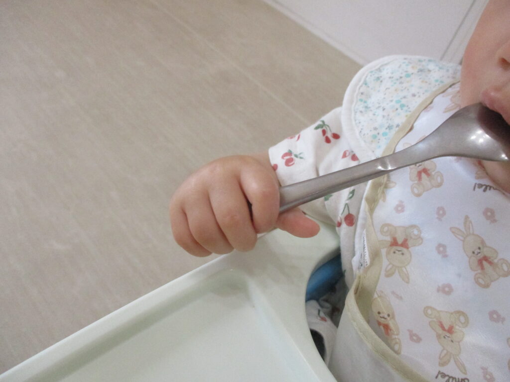 最初はうまく持つことができず、落としたり投げてしまうこともありましたが、最近はスプーンを上手に持てるようになってきました。