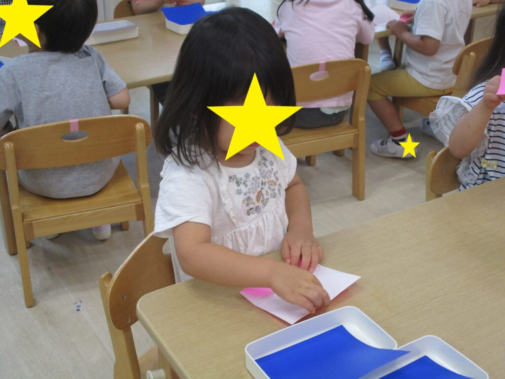 きれいに折るぞ! 2024.06.18 48view 大宮たんぽぽ保育園 今日もも組では、七夕に向けての製作を行いました! 折り紙を斜めに折るところでは、得意な子と、少し苦手な子がいる中で、子どもたちは「むずかしいなあ」「こうかな?」「アイロン♪アイロン♪」と一生懸命折っていましたよ😄💞 ◀ 前へ | たんぽぽ保育園のブログ 一覧 | 次へ ▶ 関連記事 2026.04.281歳児 こいのぼり🎏 2026.04.28鶏野菜炒め🥕🧅 2026.04.275歳児 カラーコーンゲーム✨ 2026.04.27🐟白身魚のおろし煮🍽️ たんぽぽ保育園のブログ