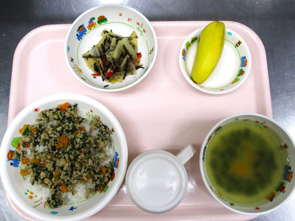 そぼろ丼🍽️みそ汁🍜ひじきと大根のサラダ🥗バナナ🍌