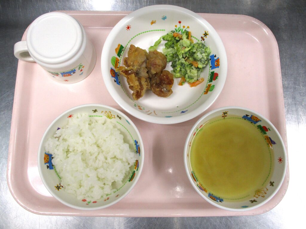 🍗鶏肉の唐揚げ🍽️ 2024.06.20 47view さいたま市 北区 大宮たんぽぽ保育園 今日の給食🌈 🍚ごはん🍜みそ汁🍗鶏肉の唐揚げ🥦ブロッコリーのサラダ🥗 いただきます。 ◀ 前へ | たんぽぽ保育園のブログ 一覧 | 次へ ▶ 関連記事 2026.04.281歳児 こいのぼり🎏 2026.04.28鶏野菜炒め🥕🧅 2026.04.275歳児 カラーコーンゲーム✨ 2026.04.27🐟白身魚のおろし煮🍽️ たんぽぽ保育園のブログ