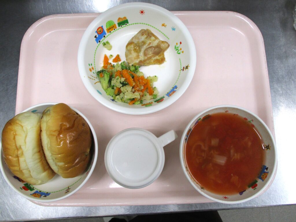 ロールパン🥐 ミネストローネ🍲 マヨチキン🍗 花野菜のごま和え🥗