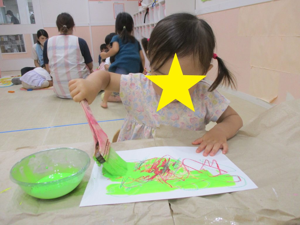クレヨンで描いた絵に絵の具を塗り、