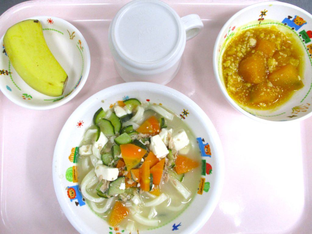 冷や汁風うどん🍜 2024.07.31 52view さいたま市北区大宮たんぽぽ保育園🌈 今日の給食🍴 冷や汁風うどん🍜 かぼちゃのそぼろ煮🍴 バナナ🍌 いただきます。 ◀ 前へ | たんぽぽ保育園のブログ 一覧 | 次へ ▶ 関連記事 2026.04.275歳児 カラーコーンゲーム✨ 2026.04.27🐟白身魚のおろし煮🍽️ 2026.04.242歳児 こいのぼり製作🎏 2026.04.24豆腐ハンバーグ🍽️ たんぽぽ保育園のブログ
