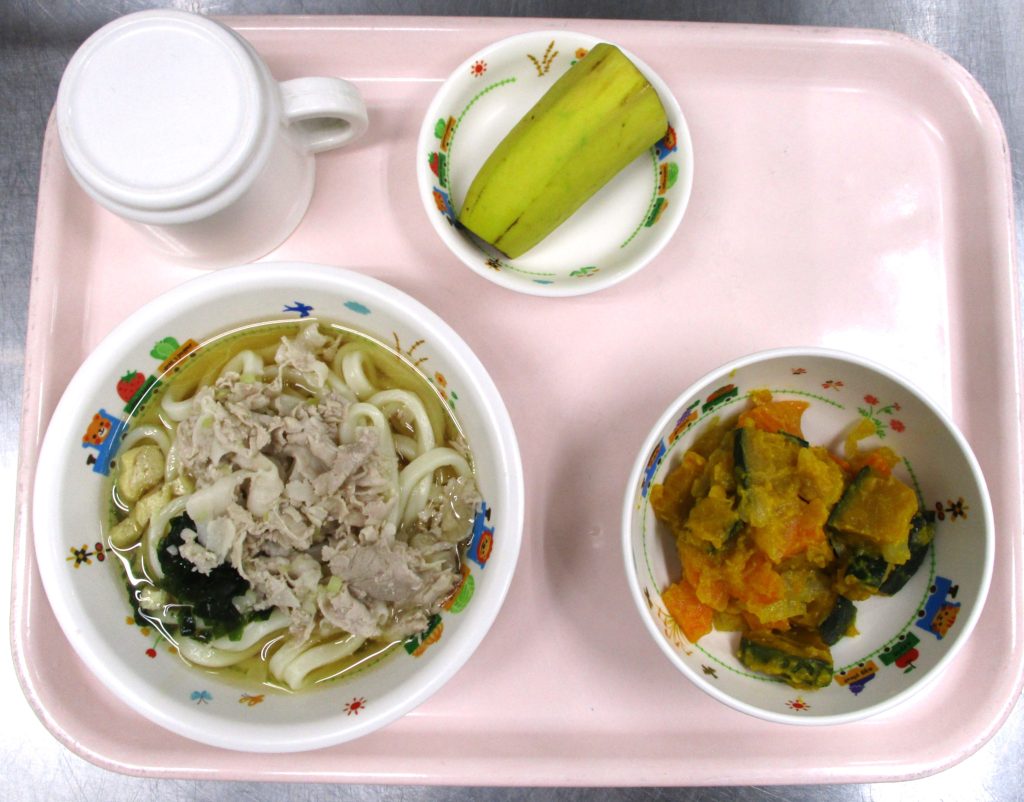 豚しゃぶうどん🍜 かぼちゃのみそドレ和え バナナ🍌