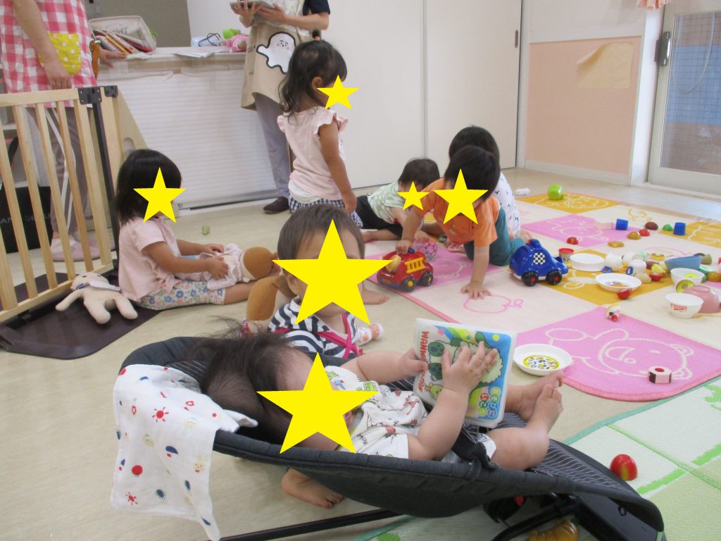 今日はお盆中で子どもたちが少なかったので、お隣の1歳児クラスのあんず組と合同保育になりました。