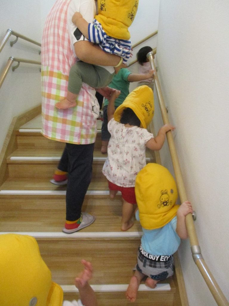 1歳児のあんず組も防災頭巾を被って階段を登り2階の教室まで避難しました。
