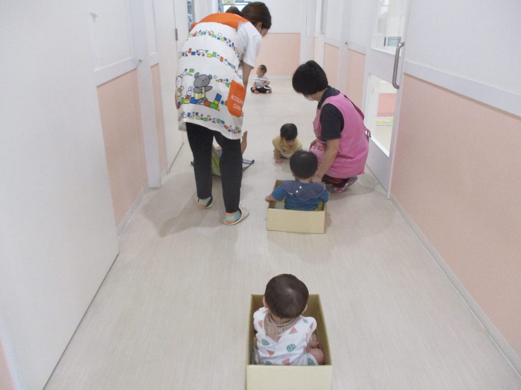 廊下に出て、ハイハイしたり、箱で作った車に乗って遊びました。