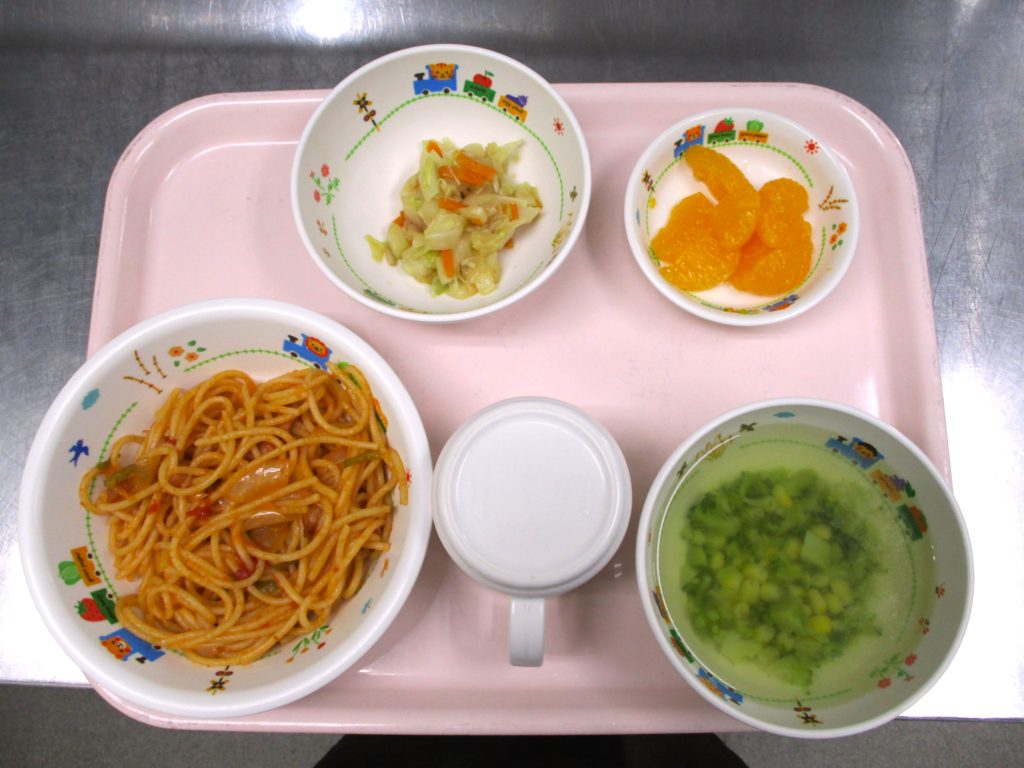 🍝ナポリタン 🥦ブロッコリーのスープ 🥗キャベツのサラダ 🍊みかん缶