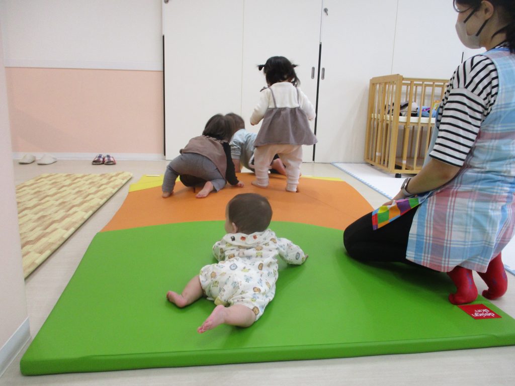 お部屋にマットのお山を作って遊びました。だんだん慣れてきてスピードがついたり、ダイナミックな動きになっていました。真ん中が穴が開いていたので、覗いて楽しんでいました🥰