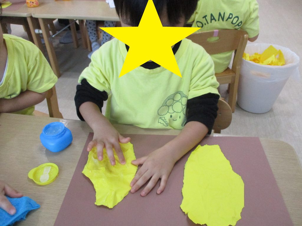 ハサミではなく手でちぎっているため、同じ形でも子どもたちによって大きさや形に個性が出ていました!「やきいもグーチーパー」を歌いながら楽しそうにちぎる子どもたちはとっても可愛かったですよ💕
