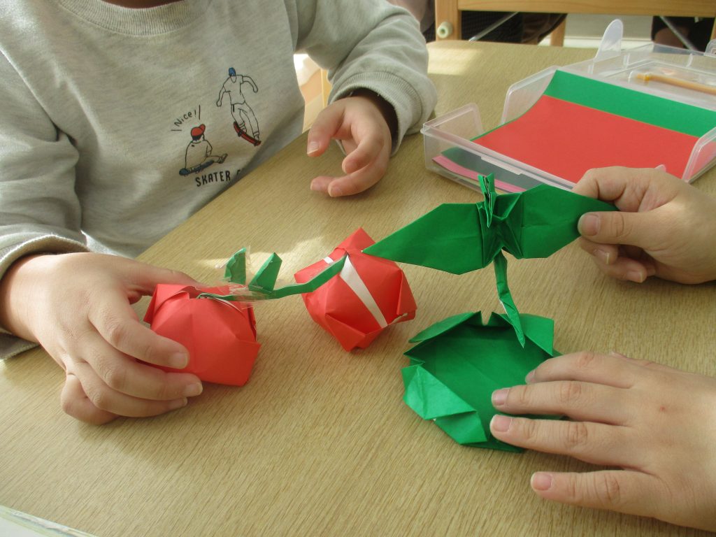 説明書を見ないで折れるようになりました✨ 2024.11.07 64view 大宮たんぽぽ保育園 お部屋遊びでは、ラキュー・塗り絵・折り紙・カード遊び等の机上遊びが人気です😄 特に折り紙では説明書を見て折るだけでなく、折り方を覚えて折ったり、自分で折り方をアレンジしたりと工夫して遊ぶ姿が見られましたよ🌈🌈 写真ではさくらんぼとドラゴンです! ◀ 前へ | たんぽぽ保育園のブログ 一覧 | 次へ ▶ 関連記事 2026.04.281歳児 こいのぼり🎏 2026.04.28鶏野菜炒め🥕🧅 2026.04.275歳児 カラーコーンゲーム✨ 2026.04.27🐟白身魚のおろし煮🍽️ たんぽぽ保育園のブログ