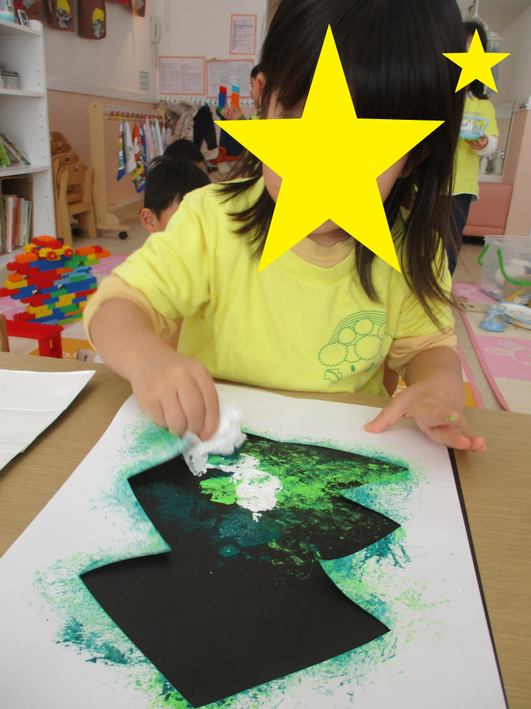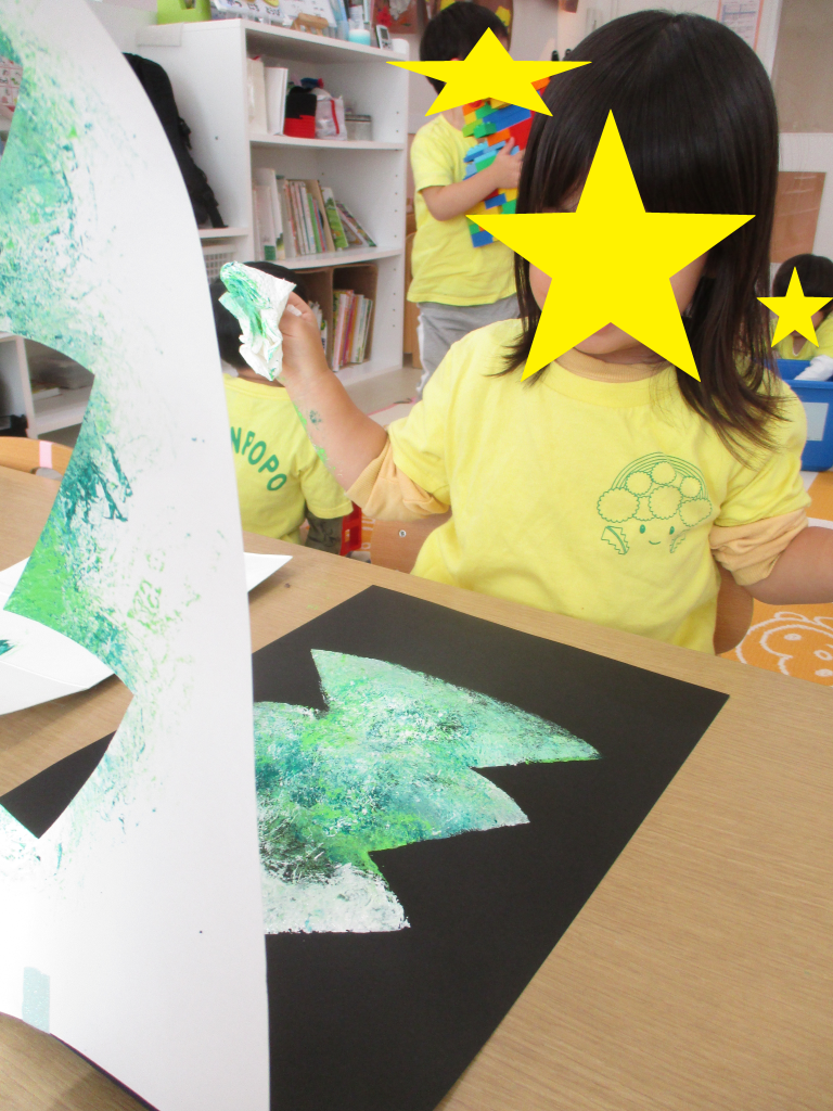 黒い画用紙の上にツリーの形に切り取った紙を乗せ、絵の具をスタンプすると型を外した時にツリーの形が浮かび上がります!
