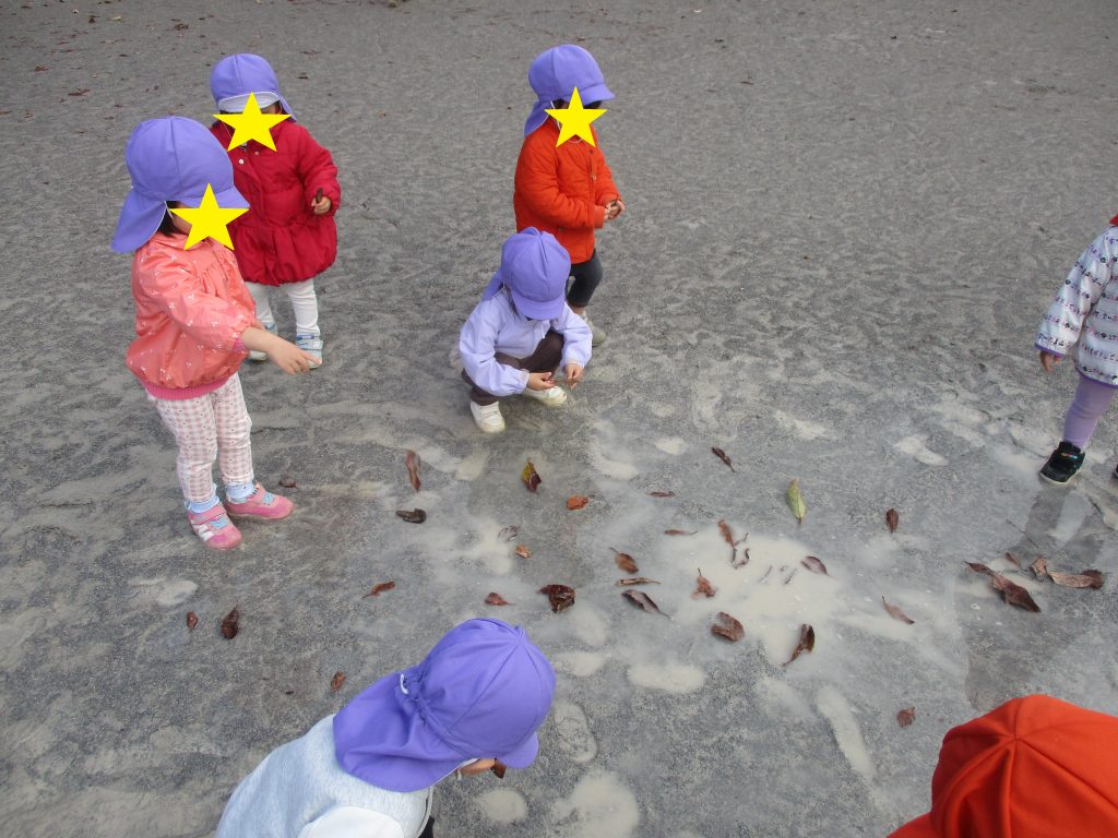 昨日は雨が降っていたので、水たまりに集まり葉っぱを船にして浮かばせて遊んだり、