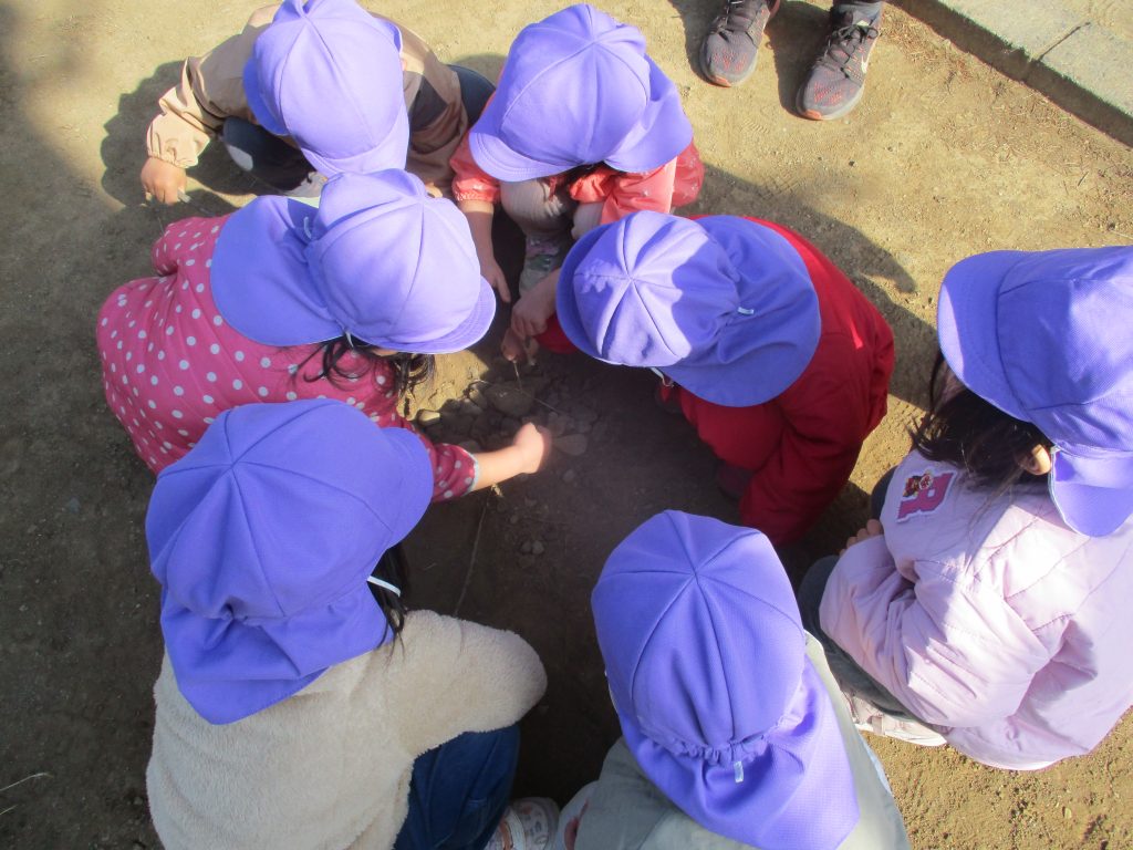 地面に凹んでいるところを見つけたいちご組さん🍓みんなで凹んでいる穴の中に石をたくさん集めて、たきぎ🔥をしたり、木の棒を持って焼きいも🍠を焼いているフリをしたり、釣り🎣をしたりと子どもたちが思い思いの遊びを楽しんでいました💕