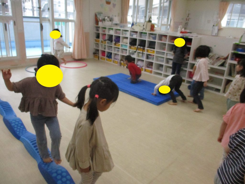 今日は雨の影響で園庭が使えなかった為、お部屋の中でアスレチックを作り、身体を動かして遊びました!🏃➡️