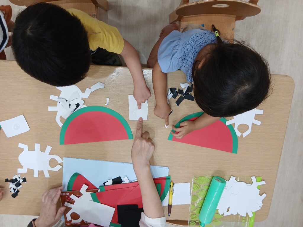 昨日行った7月の製作では、スイカ🍉とカブト虫、クワガタ虫の貼り絵をしました。