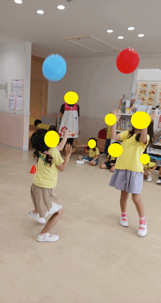 風船のコントロールが難しかったのですが、お友だちに「右だよ!下にあるよ!」「もうちょっと がんばれ!」と応援をもらって楽しむ子どもたちでした😆