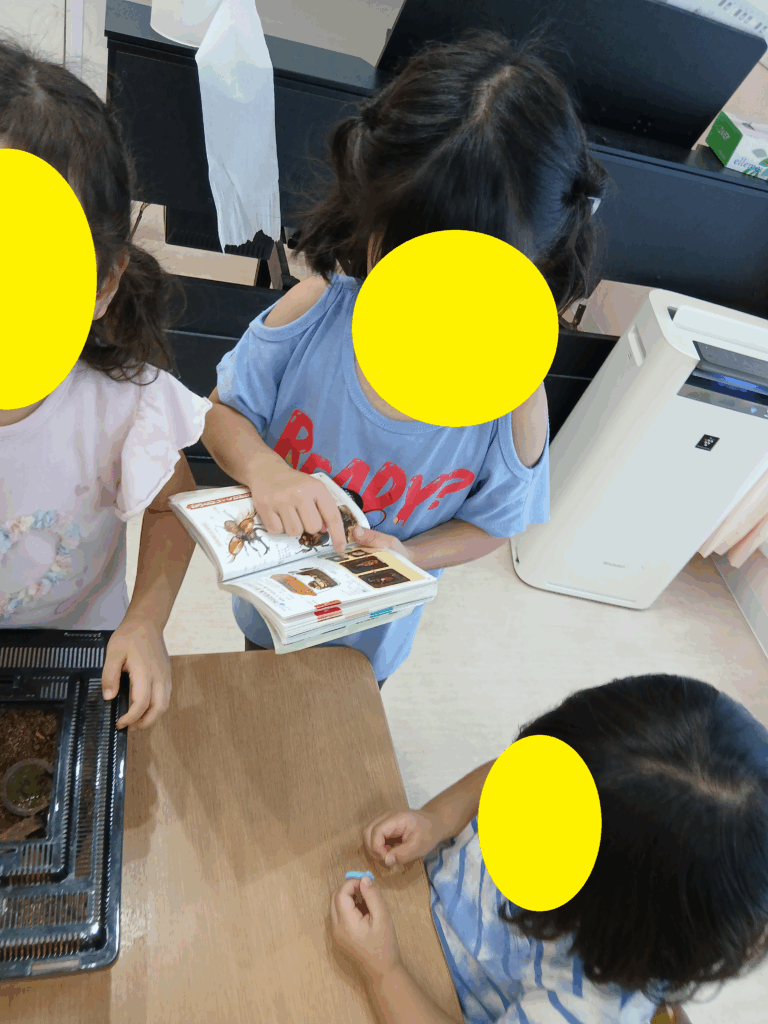 毎日、お当番さんが霧吹きで水をあげたり、ご飯をあげたりして、みんなで大切に飼っていますよ☺