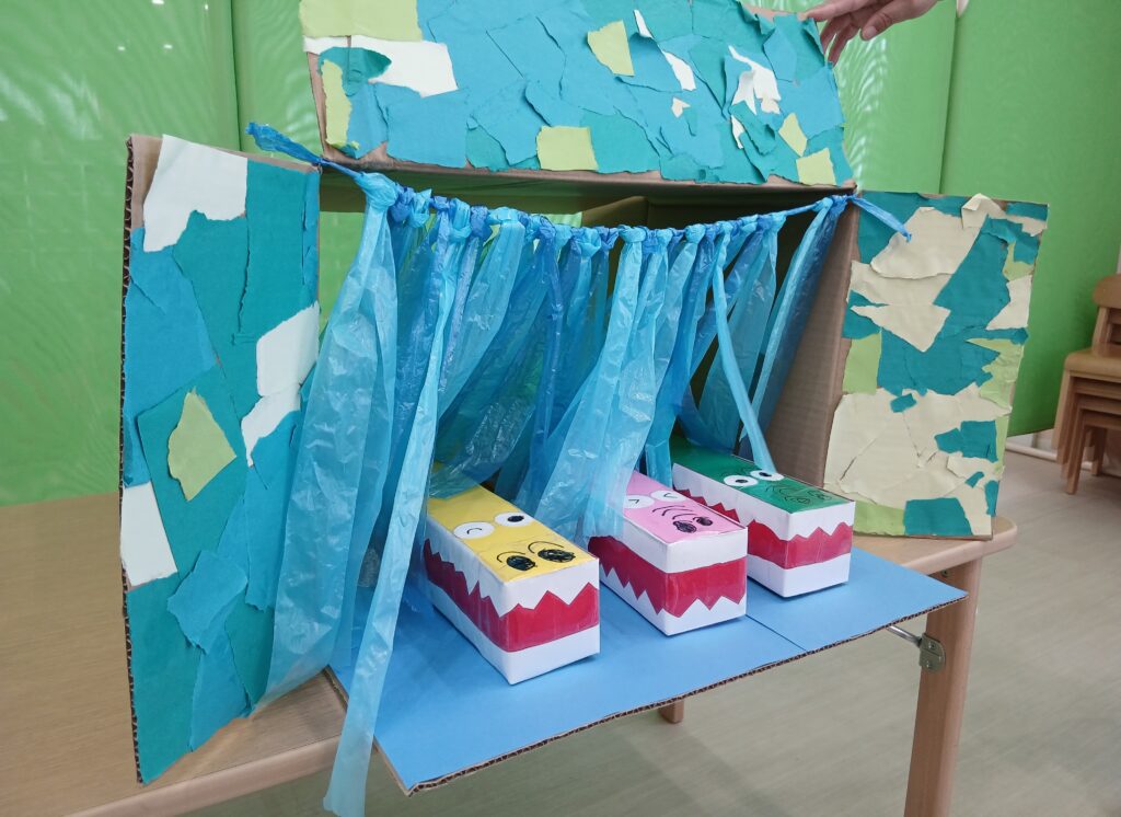 子どもたちと一から作り、ワニの顔を描いたりワニが出てくる箱を画用紙で貼って飾りつけたりと