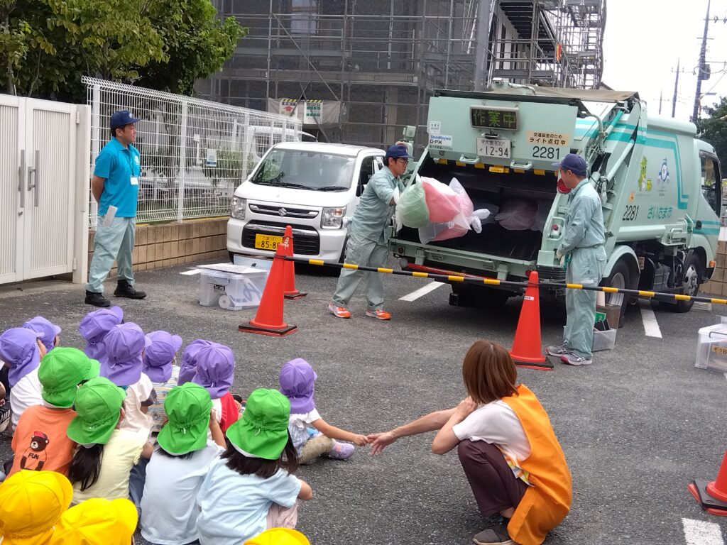 園の駐車場にゴミ収集車が停まっているのを見ると「ほんとに来てるね!」と嬉しそうにする子どもたち💓ゴミ収集車が象やシャチの重さと一緒だと学んだり、実際にゴミ収集車が動いているところを見ました👀「わーすごい!」「ゴミが食べられちゃったね」とみんなびっくりしていました😆