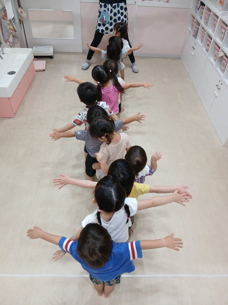 真っすぐ並ぶだけでは面白くないので、先生の真似っこをしながら楽しく練習😊🎵