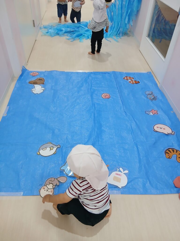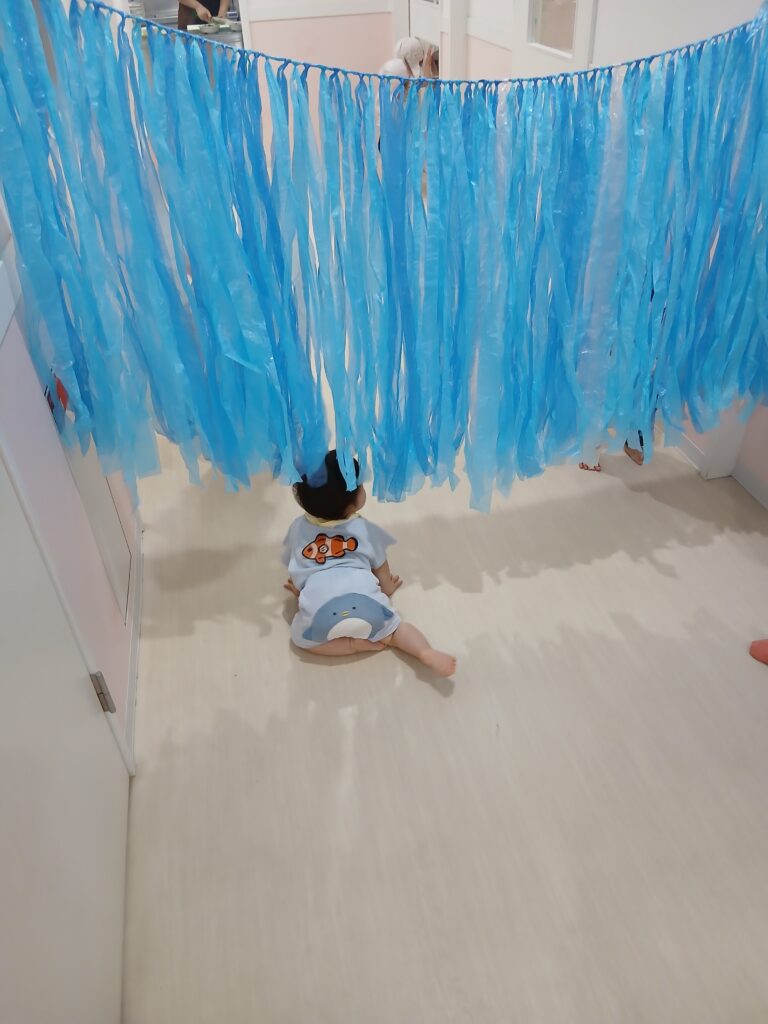 今日は廊下に出て実際に使うブルーシートの上でハイハイをしてみました🐟