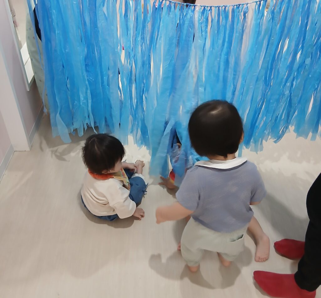 スズランテープのカーテンはみんなお気に入り💕手で触ってみたり何回もくぐったりしていましたよ。初めての運動会が楽しみなくるみ組です❤