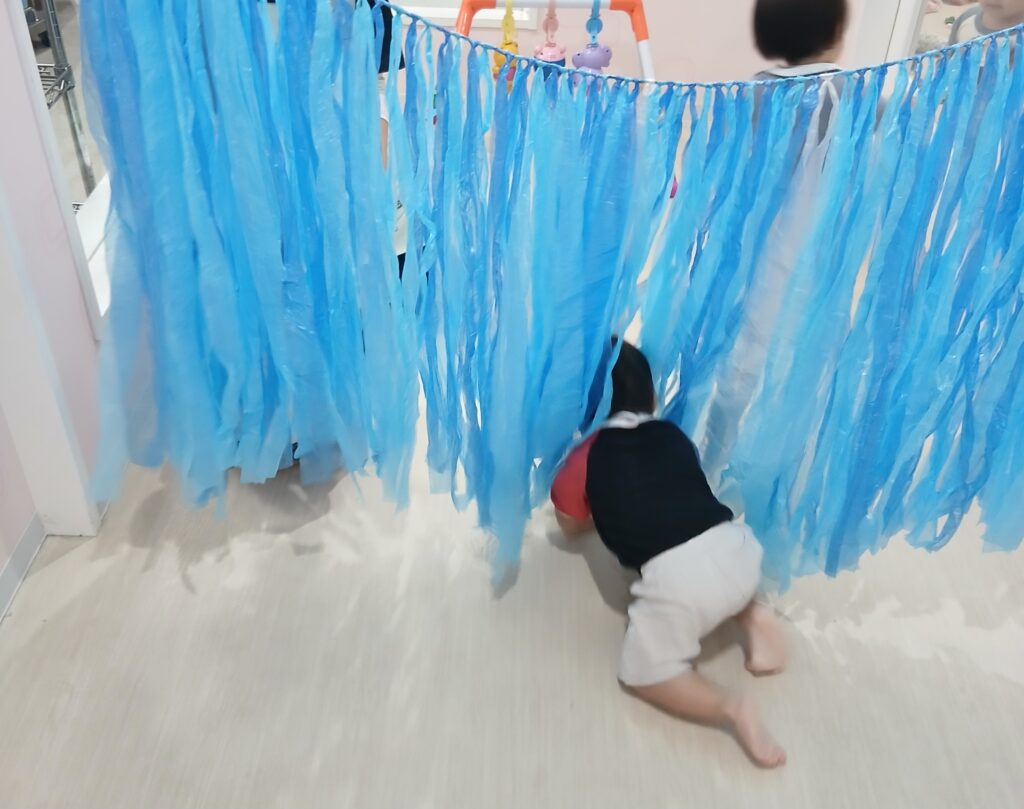 来月ある運動会でくるみ組はレジャーシートの上をハイハイしたりスズランテープのカーテンをくぐったりします♡廊下に出てやってみました!