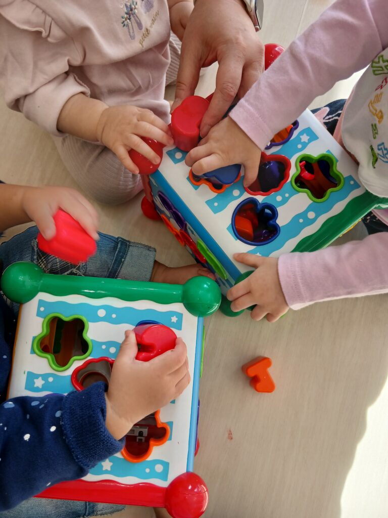 月齢の高いお友だちは、ブロックをくるくる回して型にはめることが出来るようになってきました!
