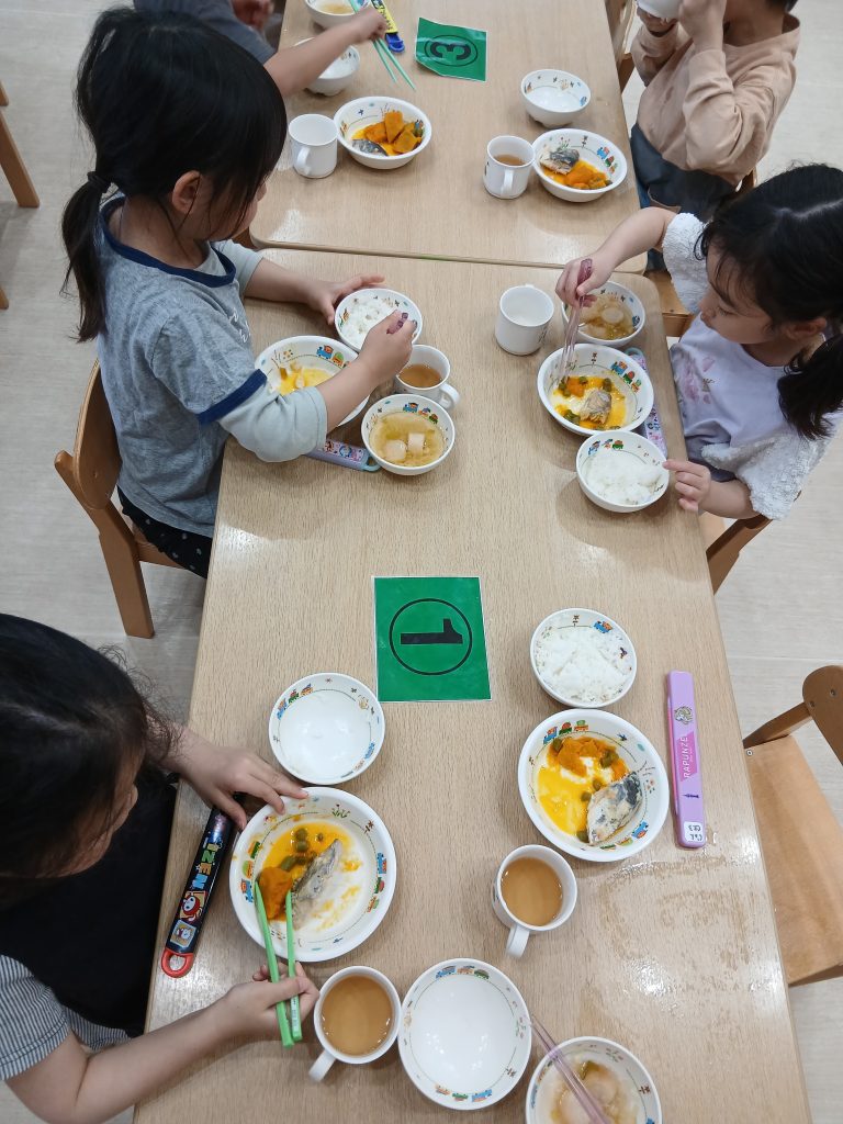 年長児になり、スプーン、フォークは使わずに箸だけで食べる練習を頑張りました💪
