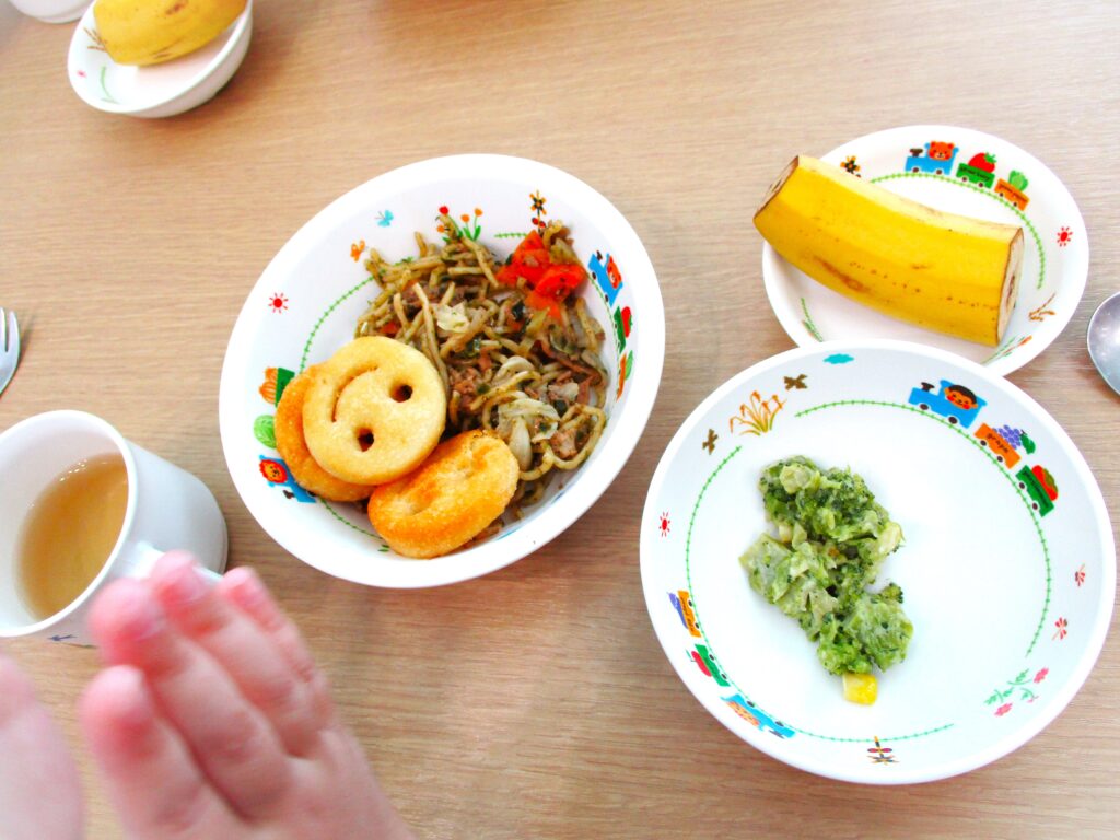 ソース焼きそば・スマイルポテト・ブロッコリーと蒸し鶏の和え物・バナナ